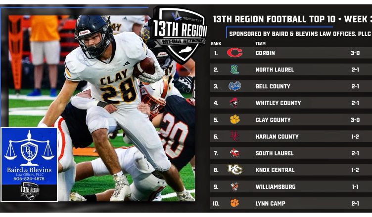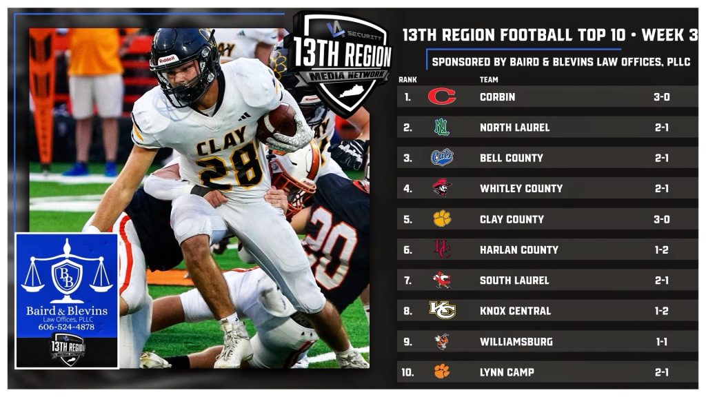 Baird & Blevins Law Offices, PLLC Presents Week Three 13th Region Football Top 10 Rankings September 8, 2024 Les Dixon Share on facebookTweet on twitter