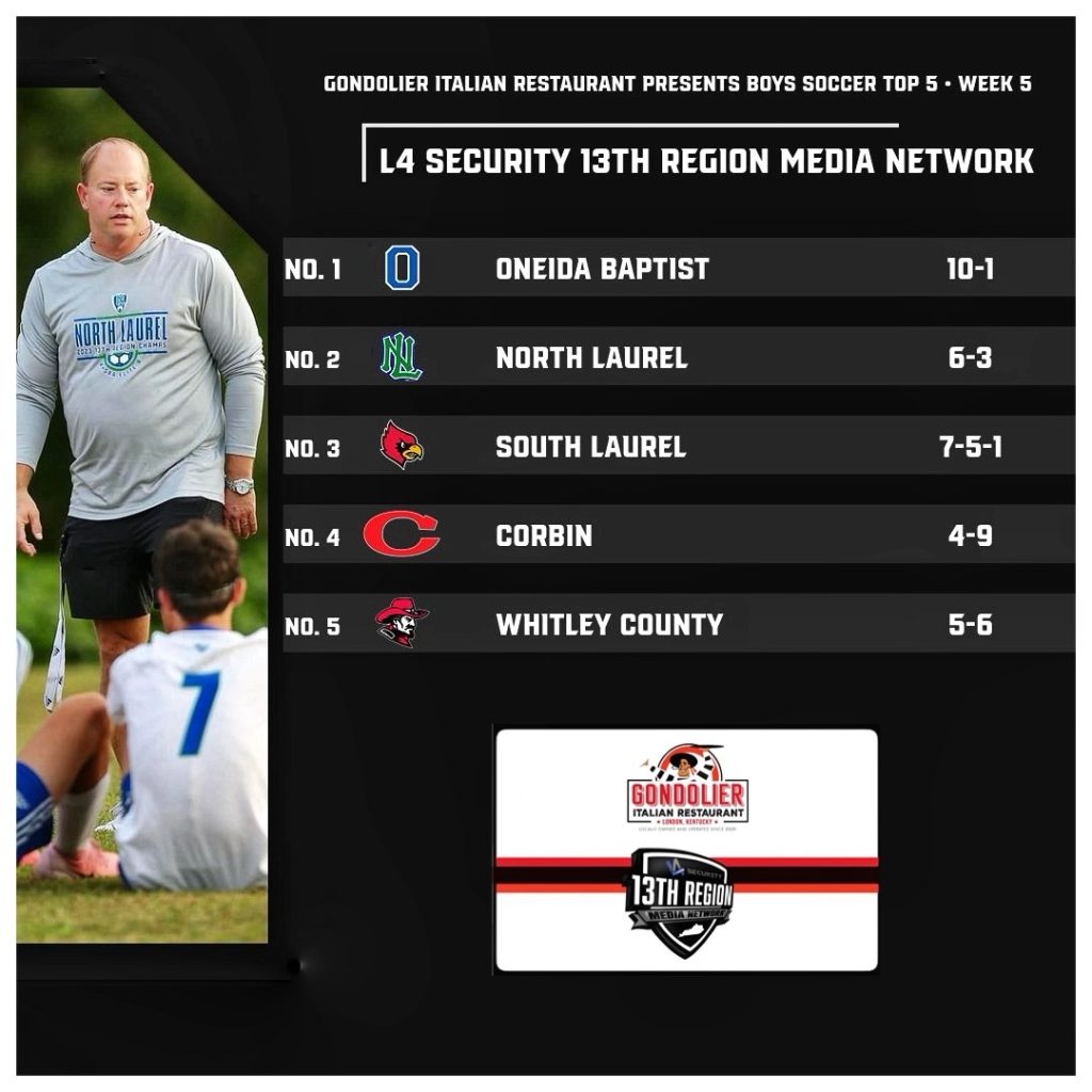Gondolier Italian Restaurant Presents Week Five 13th Region Boys Soccer Top 5 Rankings September 22, 2024 Les Dixon Share on facebookShare on twitter