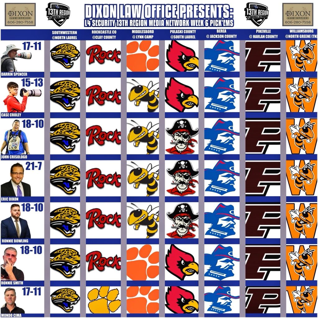 DIXON LAW OFFICE PRESENTS: L4 Security 13th Region Media Network Week Six Pick’ems September 25, 2024 Les Dixon Share on facebookTweet on twitter