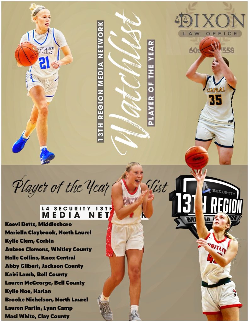 Dixon Law Office Presents: L4 Security 13th Region Media Network Girls’ Basketball Player of the Year Watchlist December 8, 2024 Les Dixon Share on facebookTweet on twitter